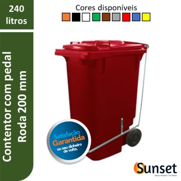 O Contentor de lixo 240 litros com pedal têm capacidade para armazenar 240 litros ou 96 kg de lixo, são dotados de rodas de borracha com 200mm de diâmetro e eixo reforçado. São resistentes ao impacto, aos raios ultravioleta e às repetidas lavagens. Garantem segurança, confiabilidade e durabilidade aos nossos clientes em razão do alto padrão de qualidade e resistência com que são produzidos.